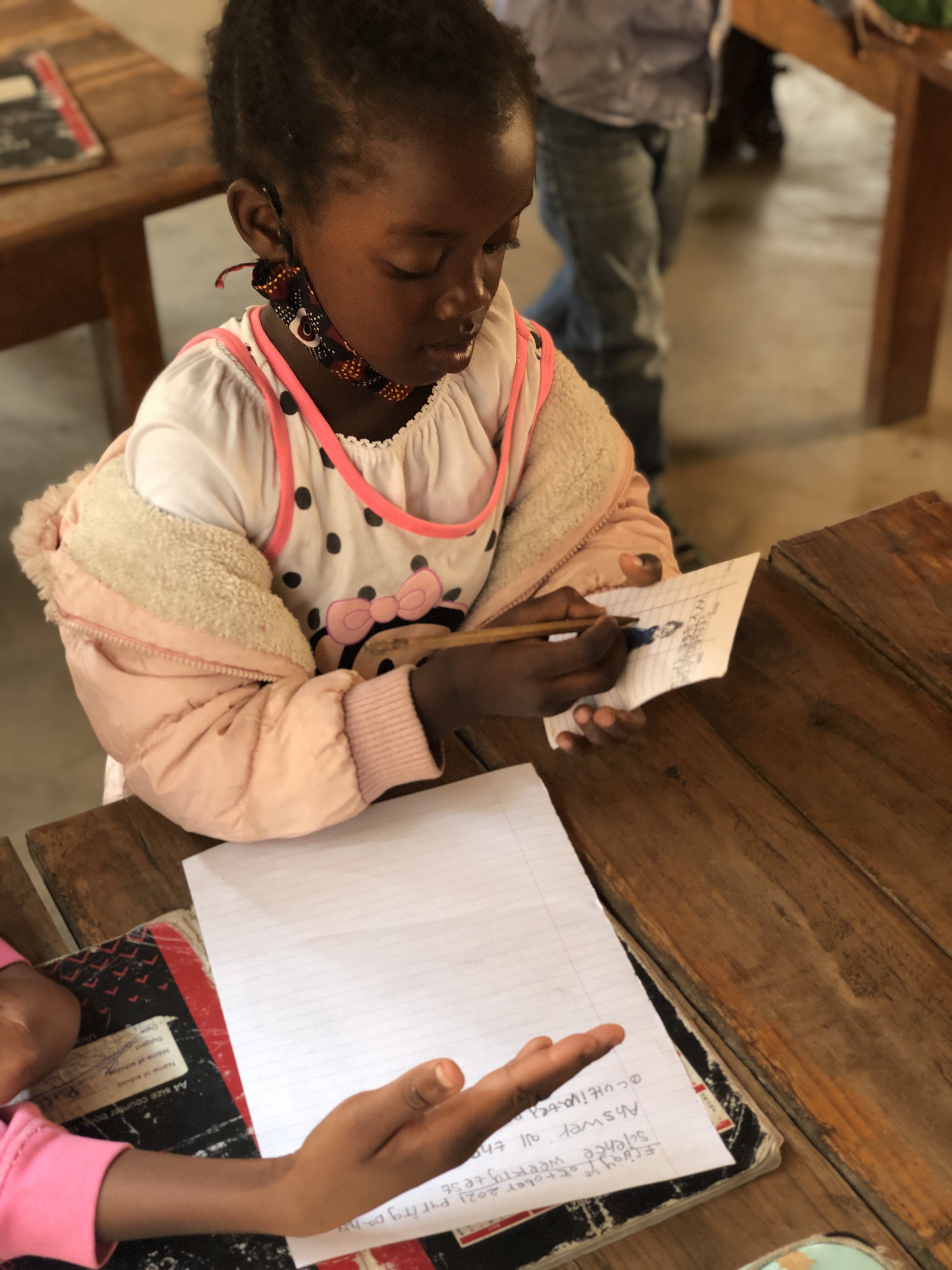 On Thursday, I got Maria and her Grade 5 (French CM2). We were still doing divisions, like last week. However, it seems that most of the kids progressed and some started to understand how it worked. The method I used to learn as a kid was not valid here, and I adapted the teaching to the local way after seeing Maria teaching a division. I really liked Maria’s teaching. She explained things simply and clearly and tried to confirm it with each pupil of her class, while motivating them with a lot of dynamism. I totally forgot, but the classroom reminded me that I gave them some homework last week, to write an informal letter addressed to me. How touching is this: