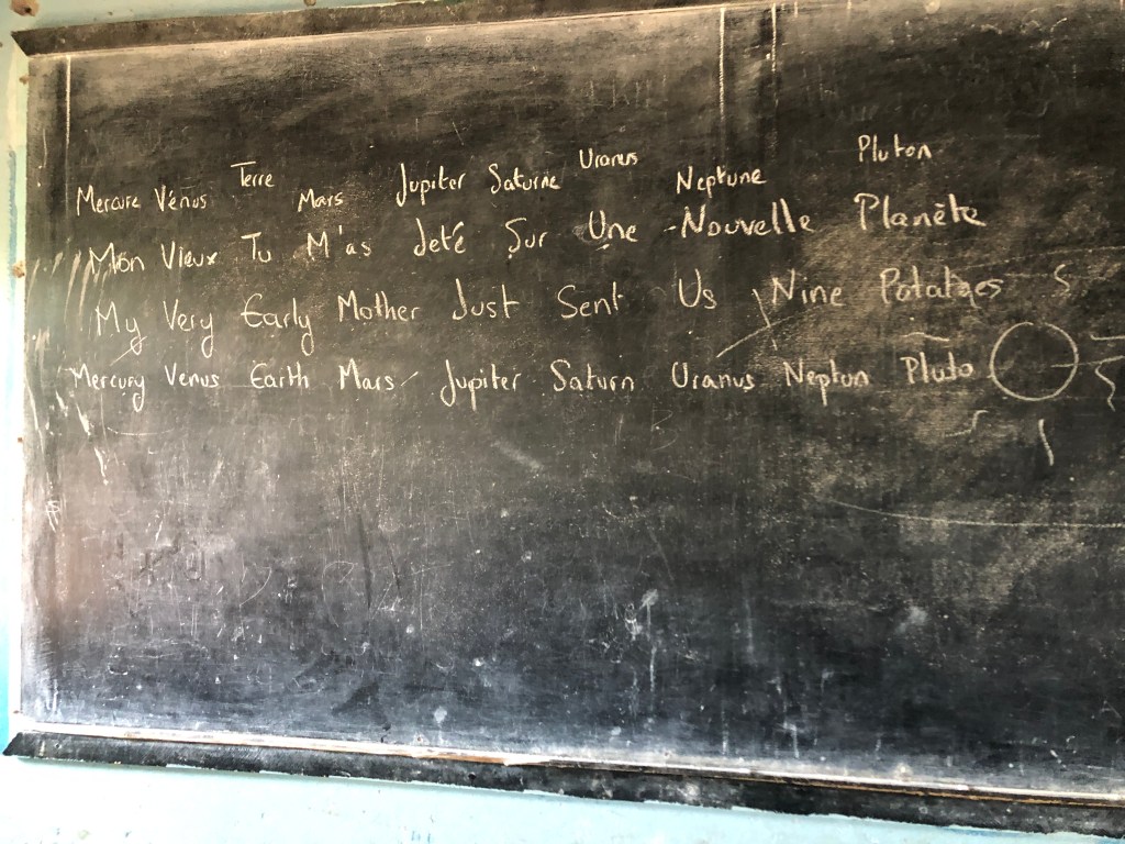 Then the last day arrived. It was a smooth Friday morning, we (with Wiseman) gave back all the remaining tests and corrected the Science paper that was the least good of all. There was a question on the planets, and they also had their mnemonic sentence. And I shared of course the French one I learnt decades ago and that was still in my memory: